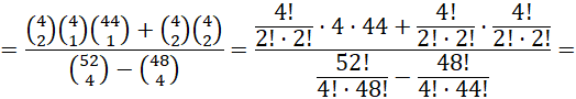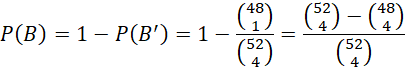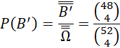 Zdarzeniem przeciwnym do B będzie niewylosowanie ani jednego asa. Losowane są więc 4 karty spośród 52 – 4 = 48 kart. Zatem: