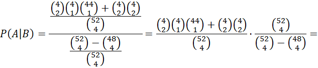 Spośród 52 kart losowane są 4. Dane jest zdarzenie polegające na tym, że wylosowano 2 króle pod warunkiem, że wylosowano minimum jednego asa. Wyznacz jego prawdopodobieństwo.