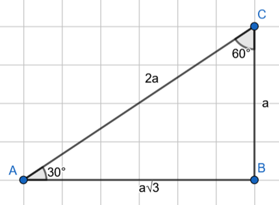 Zauważ, że trójkąt prostokątny o podanych kątach jest szczególny – długość boku naprzeciwko największego kąta jest dwa razy większa od długości boku naprzeciwko najmniejszego kąta, a długość boku leżącego naprzeciwko środowego kąta jest