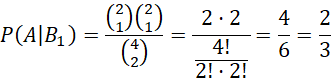 Po tym przełożeniu w pojemniku drugim znajdują się 2 kule białe i 2 czarne (łącznie 4 kule). Prawdopodobieństwo wylosowania kuli białej i czarnej przy losowaniu dwóch kul spośród wszystkich czterech, gdzie kolejność losowania nie gra roli wynosi: