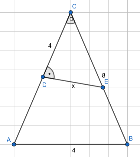 Następnie ze wzoru na cosinus w trójkącie prostokątnym wyznacz długość odcinka CE i ponownie skorzystaj ze wzoru na pole trójkąta z sinusem, aby obliczyć pole trójkąta CDE, a następnie pole czworokąta ACDE i stosunek ich pól.