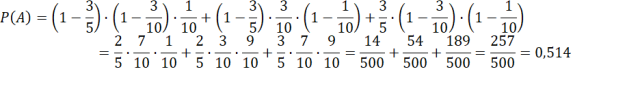 . Zauważ, że skoro zakłady wysyłają dostawy niezależnie to jeśli dwa nie wyślą swojej dostawy to jeden ją wyśle, a więc do obliczenia prawdopodobieństwa musisz zsumować takie prawdopodobieństwo, że dany zakład wyśle, a reszta nie. Wykorzystaj własność prawdopodobieństwa