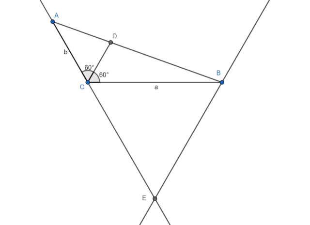 Poprowadźmy z punktu B prostą równoległą do odcinka |CD|. Oraz prostą która zawiera odcinek |AC|. Punkt ich przecięcia oznaczmy literą E.
