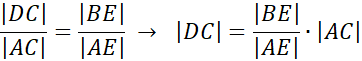 Następnie wiedząc, że odcinki |CD| i |BE| są względem siebie równoległe możemy zapisać twierdzenie Talesa: