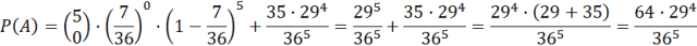 A – zdarzenie, w którym w 5 rzutach 2 kostkami do gry, maksymalnie raz wyrzucisz sumę podzielną przez 5.
