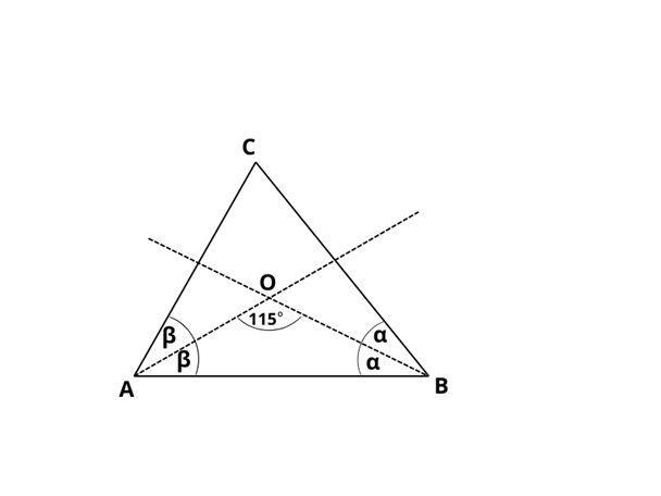 Dwusieczna dzieli kąt na dwie równe części. Oblicz miarę kątów ∢ABO i ∢OAB. Oblicz miarę kąta ∢AOB pamiętając, że suma kątów trójkąta wynosi 180°.