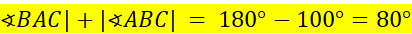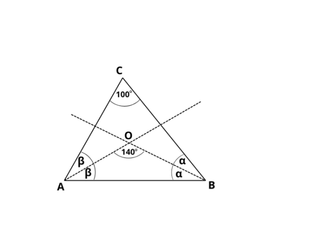 Punkt O jest punktem przecięcia dwusiecznych kątów CAB i ABC w trójkącie ABC. W tym zadaniu musisz wyznaczyć miarę kąta wklęsłego AOB, jeśli: |∢ACB| = 100°.