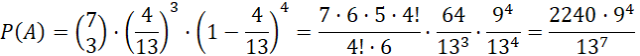 A – zdarzenie, w którym w 7 losowaniach jednej karty z talii, 3 razy wyciągniesz pika lub asa.