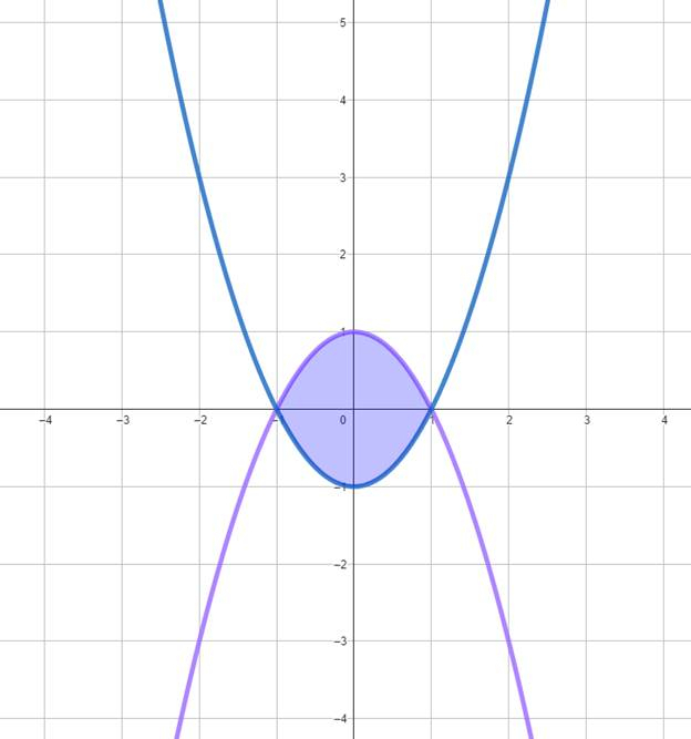 Narysuj podane parabole i zaznacz obszar, w którym jest początek układu współrzędnych. Zauważ, że w środku zaznaczonego obszaru mieści się kwadrat o polu 2, a skoro do obszaru należy więcej przestrzeni niż w tym kwadracie, to znaczy, że pole zaznaczonego obszaru jest większe od 2.