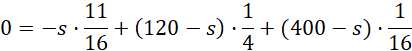 Wiedząc, że s to ilość pieniędzy, jakie gracz wnosi do gry, a uczestnik wygrywa 400 zł lub 120 zł, gdy wypadną odpowiednio 4 lub 3 orły podczas rzutu 4 monetami, określ rozkład zmiennej losowej, która wynosi tyle, ile wygrana, a następnie określ s, tak aby wartość oczekiwana była równa 0.