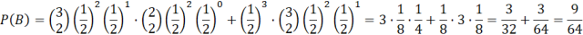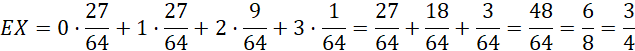 Wiedząc, że zmienna losowa X przyjmuje wartość 0, jeśli w rzucie trzema monetami wypadną same reszki, a gdy wypadnie chociaż jeden orzeł, to należy powtórzyć rzuty monetami z orłem i zmienna X przyjmie wartość równą ilości orłów w drugim rzucie, określ rozkład zmiennej losowej X i jej EX.