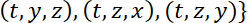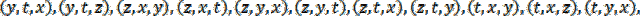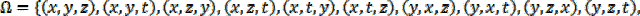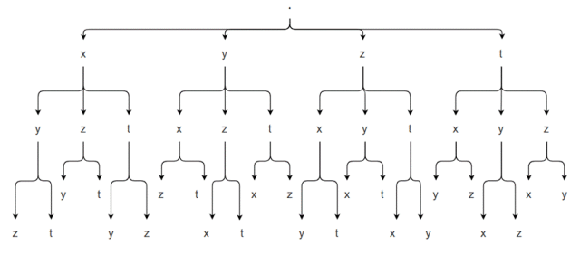 Zapisz wszystkie zdarzenia elementarne tego doświadczenia losowego, korzystając z drzewa stochastycznego i podaj liczbę tych zdarzeń, jeśli ze zbioru A = {x, y, z, t} losujemy kolejno trzy różne litery i zapisujemy je w kolejności losowania, tworząc kod trzyliterowy.
