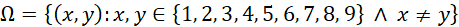 Przedstaw zbiór zdarzeń elementarnych jako parę liczb x i y, które mogą przyjąć dowolne wartości z rozpatrywanego zbioru i dodatkowo muszą być one od siebie różne.