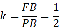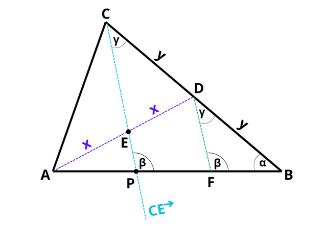 Punkt E jest środkiem odcinka AD, czyli środkowej w trójkącie ABC. |AB| zostało przecięte w punkcie P przez półprostą