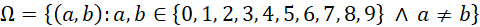 Jako pojedyncze zdarzenie tego doświadczenia można określić parę liczb a i b, które przyjmują wartość ze zbioru {0, 1, 2, 3, 4, 5, 6, 7, 8, 9}. Losowanie odbywa się bez zwracania, zatem obie współrzędne muszą być od siebie różne, a ilość sposobów dobrania drugiej cyfry jest mniejsza o 1.