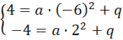 . Na koniec skorzystaj z informacji, że parabola przechodzi przez punkty A i B – podstaw współrzędne obydwu punktów i utwórz układ równań z dwoma niewiadomymi a i q, a następnie rozwiąż ten układ. Kiedy wyznaczysz wartości tych współczynników, podstaw je do równania paraboli i podaj gotowe równanie jako odpowiedź.