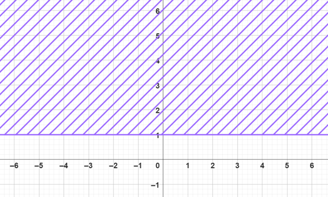 Podany zbiór punktów to cała płaszczyzna na układzie współrzędnych powyżej liczby 1 (włącznie) na osi OY i rozciągająca się w nieskończoność wzdłuż osi OX. Narysujmy go w układzie współrzędnych.