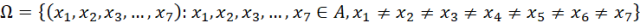 Zauważ, że przestrzenią zdarzeń elementarnych będą siedmioelementowe ciągi o różnych wyrazach, gdzie wyrazy te przyjmują wartości ze wspomnianego wyżej zbioru.