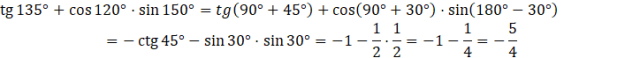 Masz wyznaczyć wartość wyrażenia tg 135° + cos 120° ⋅ sin 150°.