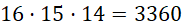 Zauważ, że przestrzenią zdarzeń elementarnych będą pewne trójki elementów, gdzie każdy z nich może przyjąć jedną z 16 wartości, a wartości te nie mogą się powtarzać.