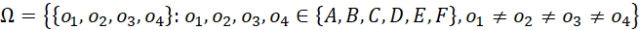 Pojedynczym zdarzeniem elementarnym będzie zbiór czterech elementów, gdzie każdy z nich przyjmuje wartość ze zbioru {A, B, C, D, E, F}. Wartości te nie mogą się powtarzać.