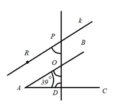 Dany jest kąt ostry BAC, |∢BAC| = 39°, oraz punkt P, leżący na zewnątrz tego kąta. Z punktu P poprowadzono dwie proste: jedną równoległą do ramienia AB, a drugą prostopadłą do ramienia AC. W tym zadaniu musisz obliczyć miarę kąta ostrego przecięcia się tych prostych.
