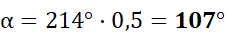Kąt α jest dwa razy mniejszy od kąta o mierze 214 stopni.