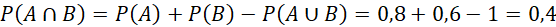 Oblicz P(A∩B) dla P(A) = 0,8, P(B) = 0,6, A∪B = Ω.