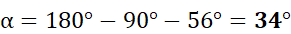 Znajdź drugi kąt o mierze 56 stopni oparty na tym samym łuku, a następnie oblicz miarę kąta α pamiętając, że trójkąt oparty na średnicy okręgu jest prostokątny.
