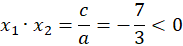 Aby sprawdzić, czy równanie ma pierwiastki oblicz deltę. Kolejno skorzystaj ze wzorów Viete’a. Suma pierwiastków jest dodatnia, a ich iloczyn jest ujemny, więc pierwiastki mają różne znaki.