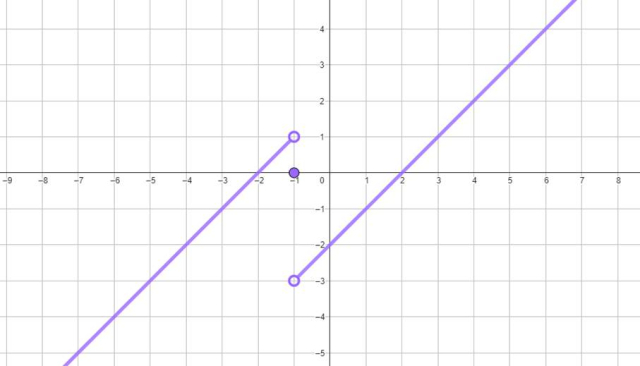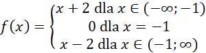 Narysuj podane fragmenty funkcji w odpowiadających im przedziałach. Pamiętaj przy zaznaczaniu krańców prostej, że jeżeli punkt ten należy do dziedziny, oznaczamy go wypełnionym kółkiem, a jeżeli nie należy, oznaczamy to kółkiem niewypełnionym. Oznacz miejsce złączenia się prostych kółkiem z wypełnieniem, aby wskazać, że ono również należy do wykresu.