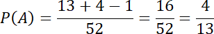 Skorzystaj z tego, że w talii kart jest po 13 kart w jednym kolorze, i po 4 w jednej figurze. Pamiętaj, aby odjąć jedną kartę: król kier, który był policzony dwukrotnie. Następnie skorzystaj ze wzoru na obliczania prawdopodobieństwa:
