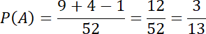 Skorzystaj z tego, że w talii kart jest po 13 kart w jednym kolorze, i po 4 w jednej figurze. Pamiętaj, aby odjąć jedną kartę: dwójkę kier, która była policzona dwukrotnie. Następnie skorzystaj ze wzoru na obliczania prawdopodobieństwa: