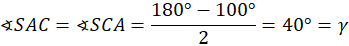 Kąt alfa i kąt ABC są kątami naprzemianległymi w czworokącie wpisanym w okrąg, więc dają w sumie 180°. Kąt beta tworzy z podanym kątem kąt przyległy, więc mają w sumie 180°. Kąt ASC jest dwa razy dłuższy od kąta ABC, bo są one kątami wpisanym i środkowym opartymi na tym samym łuku. Trójkąt ASC jest równoramienny, bo dwa z jego boków są promieniami, więc policz miarę kąta gamma, korzystając z sumy kątów w trójkącie ASC.