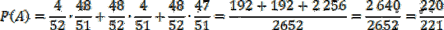 Wyznacz prawdopodobieństwo zdarzenia, że co najwyżej jedna z wylosowanych kart jest asem, jeśli z talii 52 kart losujemy kolejno bez zwracania dwa razy po jednej karcie.