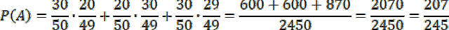 Wyznacz prawdopodobieństwo zdarzenia, że student zda egzamin., jeśli umie odpowiedzieć na 30 spośród 50 pytań zamieszczonych w zestawie egzaminacyjnym, losuje dwa pytania i jeśli odpowie dobrze na przynajmniej jedna z nich, to zda egzamin.