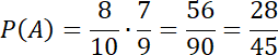 Wyznacz prawdopodobieństwo zdarzenia, żadna z wylosowanych kul nie jest czerwona, jeśli w pudełku znajdują się rozróżnialne kule: 2 czerwone, 3 białe i 5 niebieskich i losujemy kolejno bez zwracania dwa razy jedną kulę.