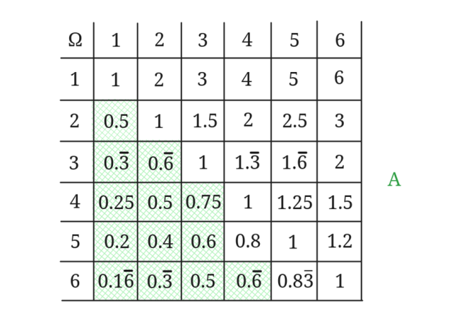 Ω – Iloraz oczek wszystkich możliwych dwuwyrazowych wariacji rzutu symetryczną kostką do gry.