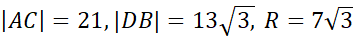 Należy wyznaczyć promień okręgu opisanego na danym czworokącie oraz przekątne tego czworokąta.