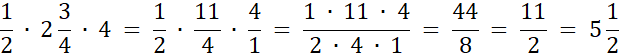 Zamieniamy liczby mieszane na ułamki niewłaściwe. W mnożeniu ułamka razy ułamek, mnożymy osobno liczniki przez siebie i osobno mianowniki przez siebie.
