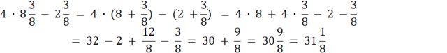 W mnożeniu ułamka przez liczbę całkowitą, mnożymy licznik razy tę liczbę, a mianownik zostawiamy taki sam. Korzystamy z rozdzielności dzielenia względem dodawania.