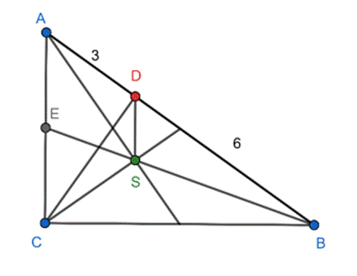 oraz |AC|<|BC|, zaznaczono środek ciężkości S i spodek D wysokości CD. W tym zadaniu musisz wykazać, że jeśli |AD| = 3 oraz |BD| = 6, to odcinek DS jest równoległy do boku AC, a jego długość jest równa