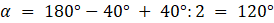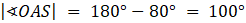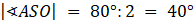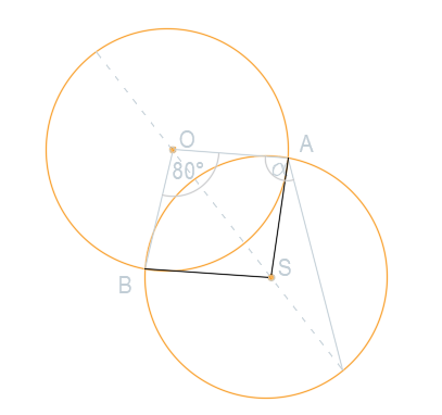 Dane są okręgi o środkach O i S. Ich promienie są sobie równe, a ich przecięcie wyznaczają punkty A oraz B. Podaj miarę kąta α, jeśli miara kąta AOB wynosi 80°.