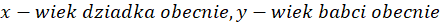W tym zadaniu musisz podać wiek dziadka i babci obecnie, jeżeli dziadek teraz ma 1,5 razy więcej lat niż babcia 10 lat temu. Wiadomo również, że gdy babcia będzie miała tyle lat, ile dziadek ma teraz to razem będą mieli 144 lata.