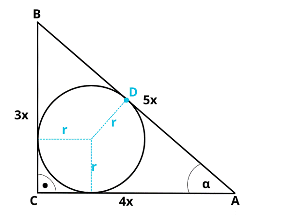 Wyznacz długości boków trójkąta w zależności od x. Następnie ze wzoru wyznacz promień okręgu wpisanego i go oblicz. Z twierdzenia o odcinkach stycznych uzupełnij rysunek i opisz pola trójkątów