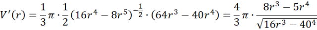 Wyznacz pochodną podanej funkcji i jej miejsca zerowe, a następnie największą wartość. Na koniec dla wyznaczonej długości krawędzi, wyznacz długości pozostałych.