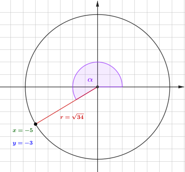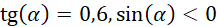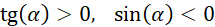 Najpierw zauważ, że skoro tangens jest dodatni, a sinus ujemny, to kąt znajduje się w III ćwiartce układu, czyli obie współrzędne punktów znajdujących się na ramieniu końcowym są ujemne. Korzystając z zależności