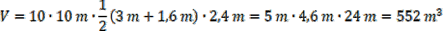 W tym zadaniu musisz obliczyć objętość 10 foliowych tuneli o długości 10 m, których przekrojem poprzecznym jest trapez równoramienny o wysokości wynoszącej 2,4 m i podstawach długości 3 m oraz 1,6 m.