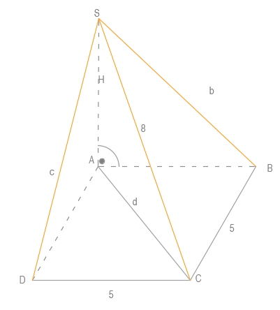 Dany jest ostrosłup ABCDS, którego podstawa ABCD jest kwadratem o boku 5. Krawędź AS jest jego wysokością. Najdłuższa krawędź wynosi 8. Znajdź długość reszty krawędzi bocznych.