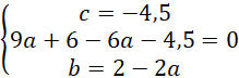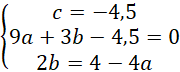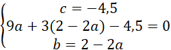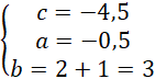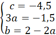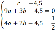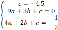 Podstawiamy wartości z punktów do wzoru funkcji, tworząc równanie z trzema niewiadomymi, po którego rozwiązaniu otrzymamy wszystkie współczynniki potrzebne do zapisu wzoru funkcji.
